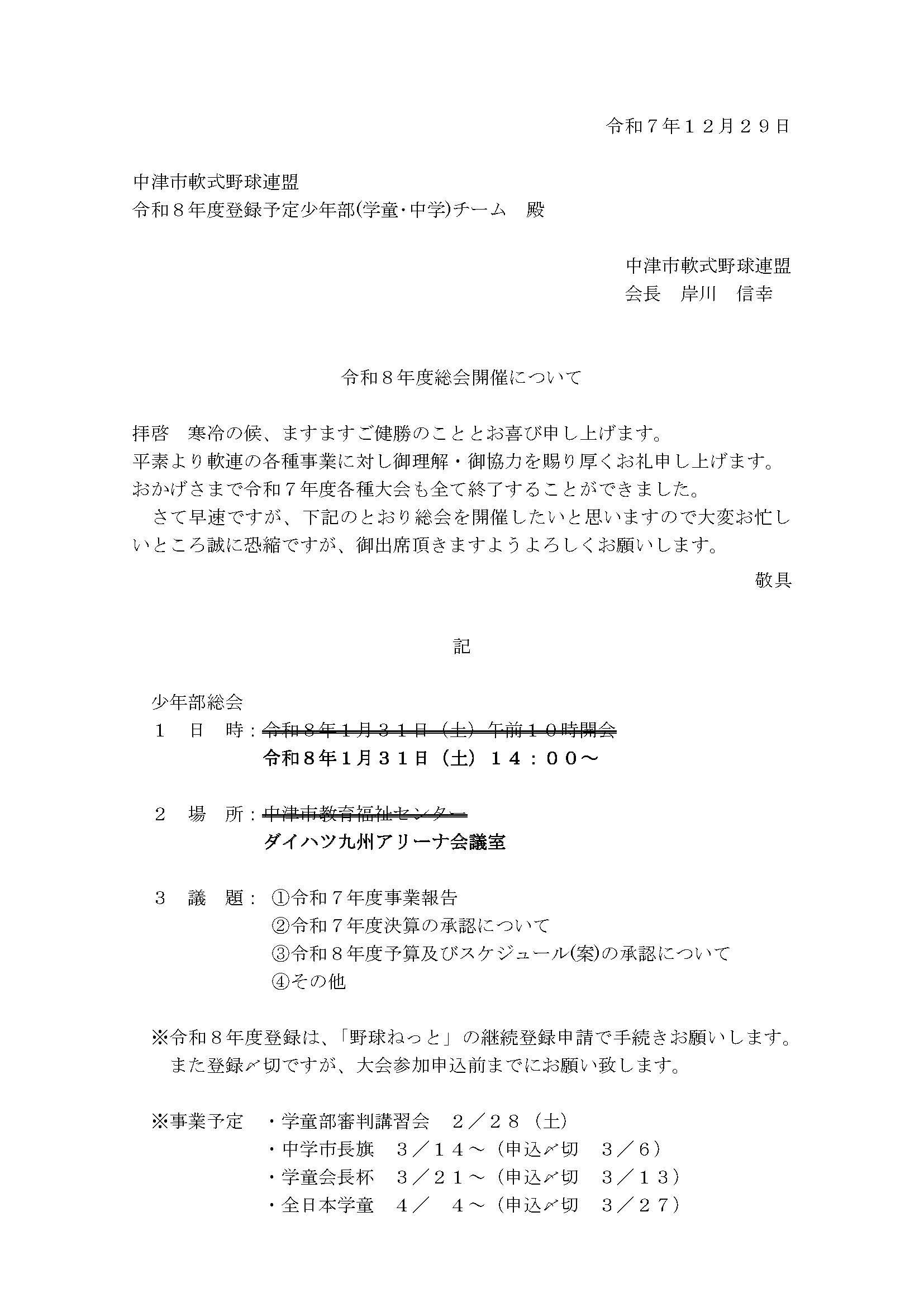 ・12/27 少年部変更:令和8年度総会開催のお知らせ