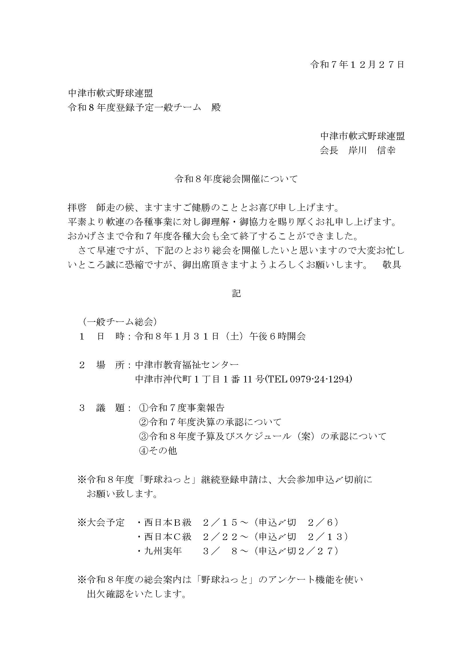 ・中津市軟式野球連盟の令和8年度総会(一般・少年)を、以下の通り開催いたしますのでお知らせいたします。