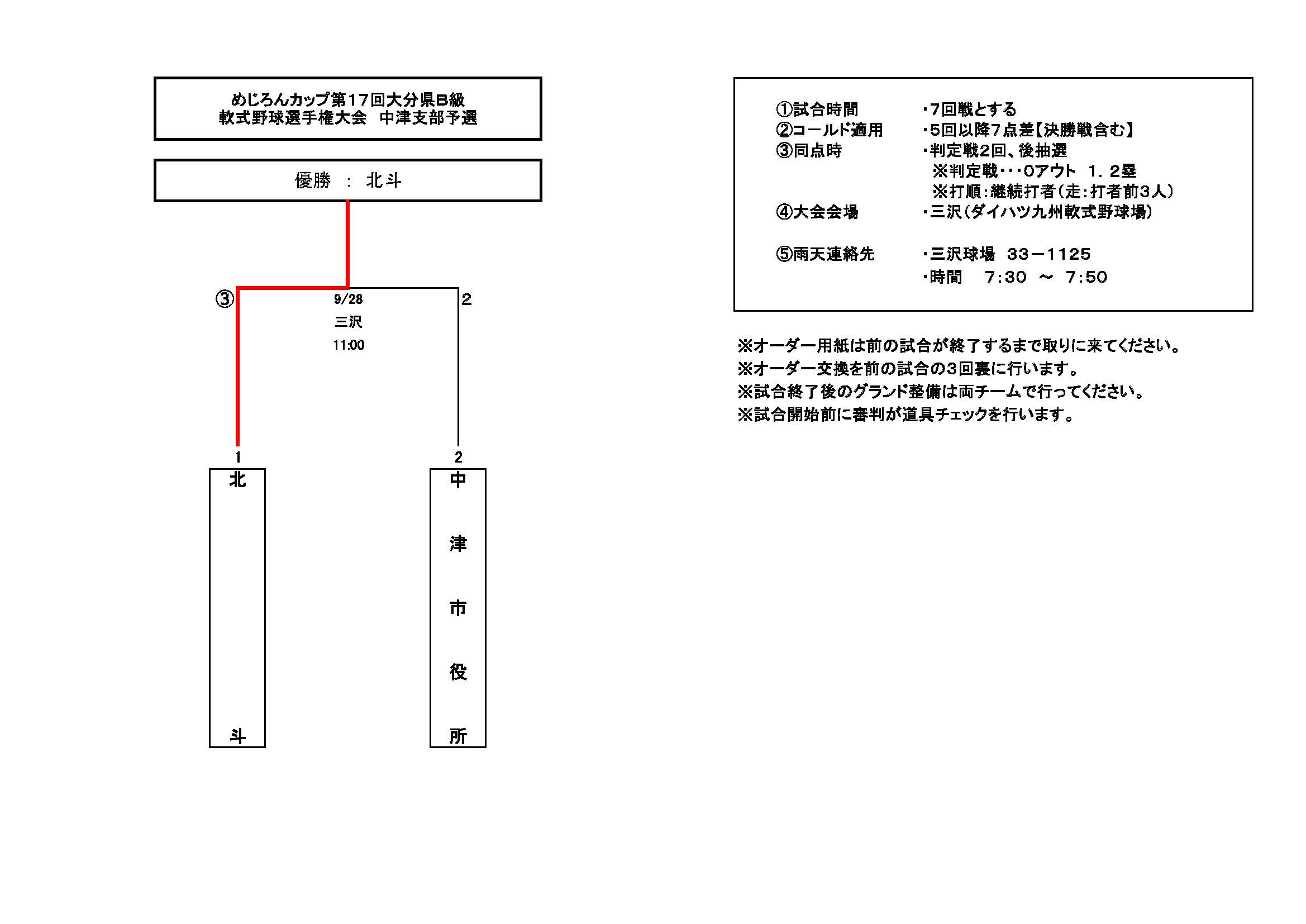 2025年9月28日/ 最終更新日時 : 2025年9月28日 中津レンタカー組合せ・結果2025 ・09/28 めじろんカップ第17回大分県B級軟式野球選手権大会中津支部予選は《北斗》が優勝しました。・めじろんカップ第17回大分県B級軟式野球選手権大会中津支部予選は《北斗》が優勝しました。click□(PDFファイル) ⇒ R7めじろんカップ(B級)② ≪記事一覧に戻る