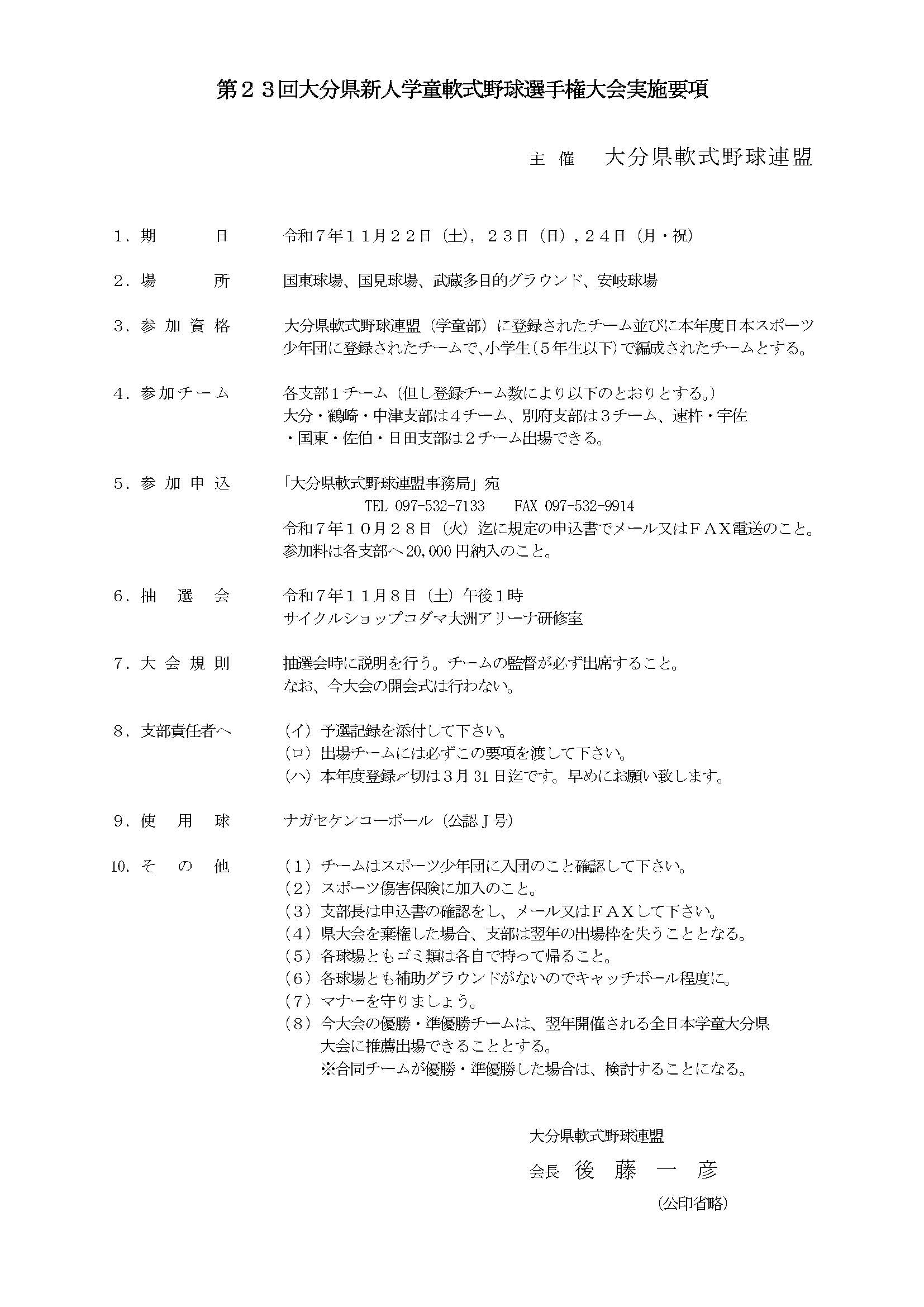 ・第23回大分県新人学童軟式野球選手権大会の大会要項です。