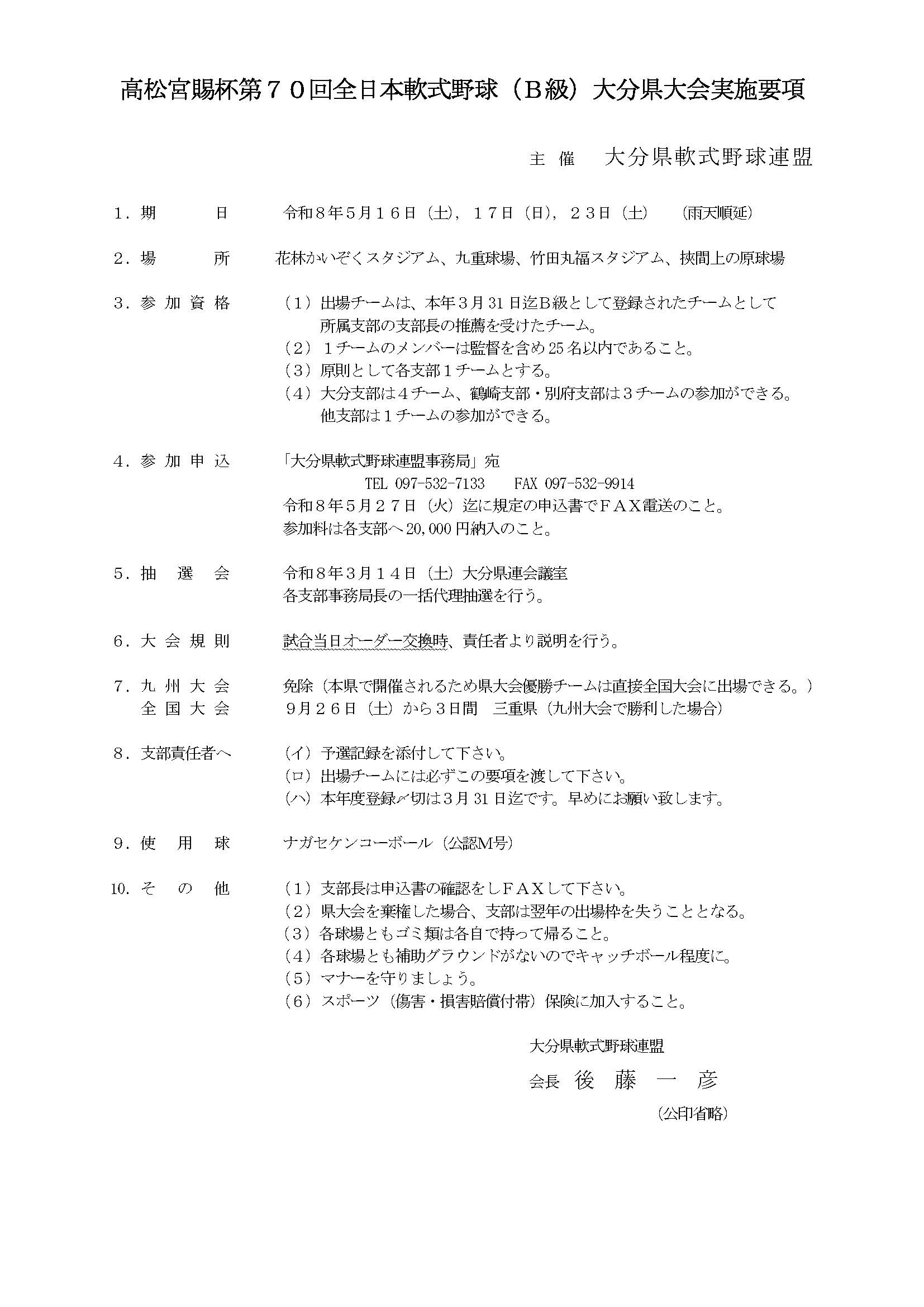 ・第70回高松宮賜杯軟式野球大会1部(B級)大分県大会の大会要項です。