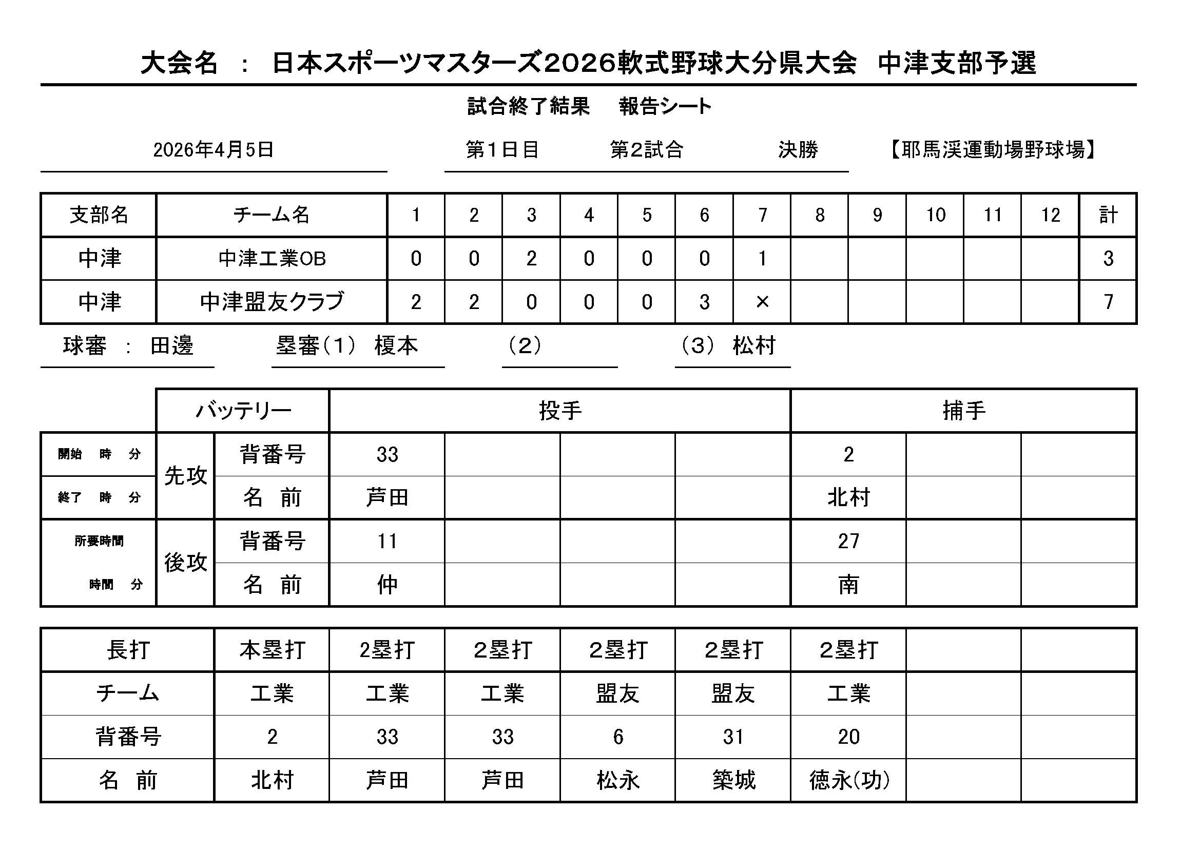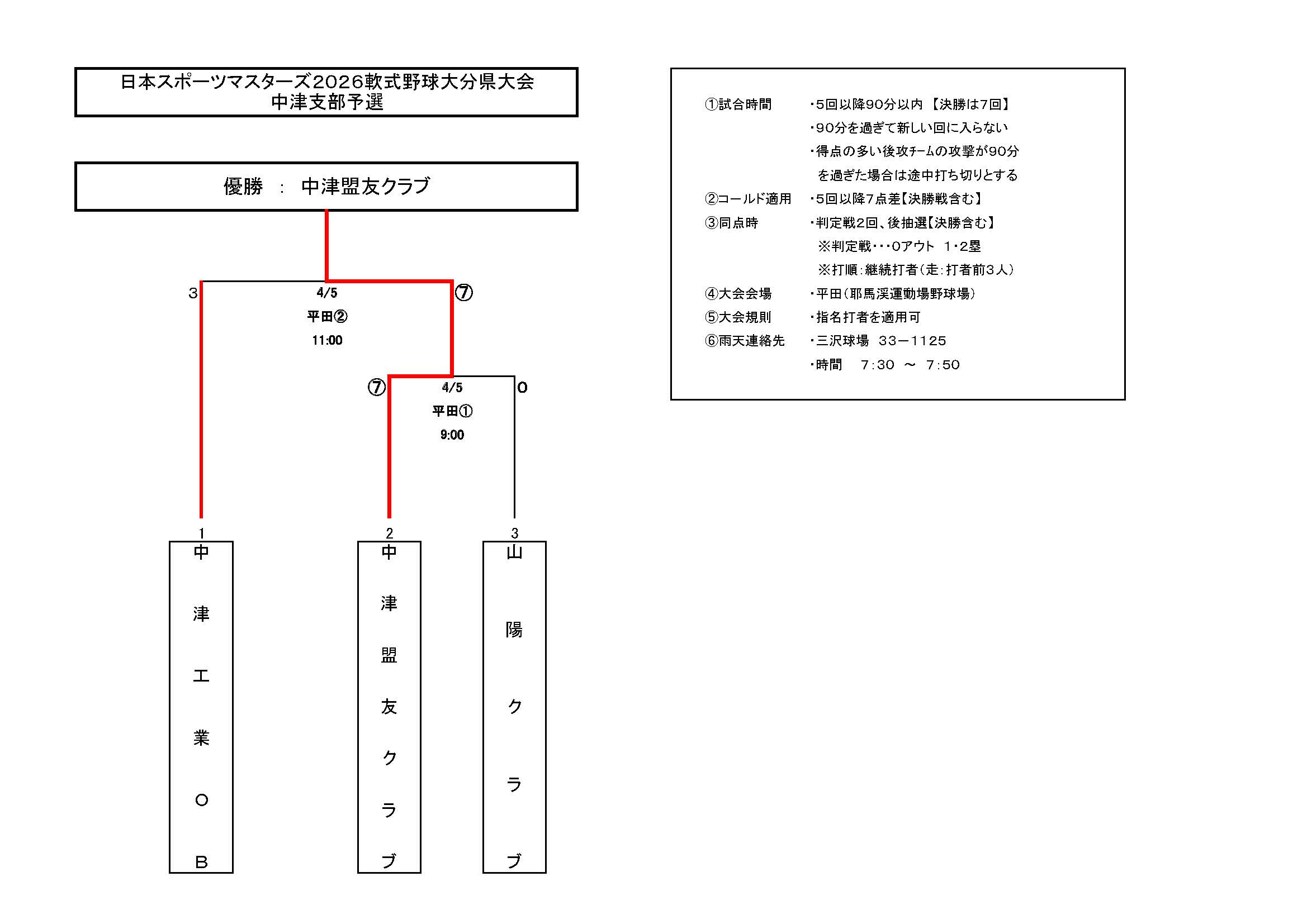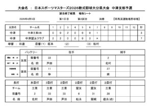 2026年4月5日/ 最終更新日時 : 2026年4月5日 中津レンタカー組合せ・結果2026 ・04/05 日本スポーツマスターズ2026大分県大会中津支部予選:優勝《中津盟友クラブ》・日本スポーツマスターズ2026大分県大会中津支部予選は《中津盟友クラブ》が優勝しました。※click□(PDFファイル) ⇒ スポーツマスターズ2026② ≪記事一覧に戻る
