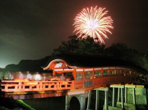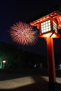 みこし発祥の地と言われる大分県宇佐市で行われる夏祭り(御神幸祭)内で、夜空を飾ります。