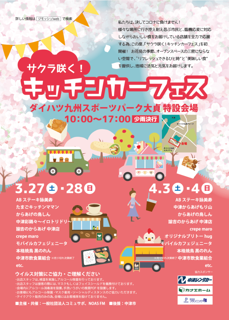 そこで、一生懸命に事業継続をされている飲食店を応援し、桜の想い出を地元の皆さんと一緒に楽しむ為、キッチンカーを集めた「テイクアウト」イベント「サクラ咲く!キッチンカーフェス」を開催します。